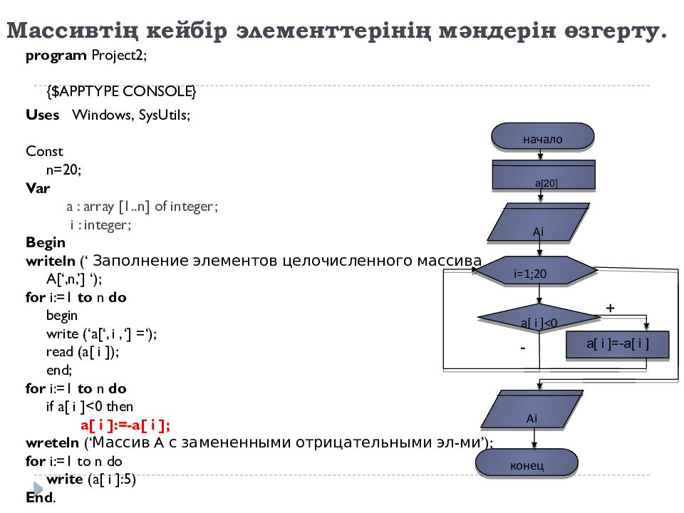 program Project2; {$APPTYPE CONSOLE} Uses Windows, SysUtils ; Const n=20; Var a : array [1..n] of integer; i : integer; Begin writeln ( ‘ Заполнение элементов целочисленного массива A[ ‘,n,’] ‘ ); for i :=1 to n do begin write (‘a[‘, i, ‘] =‘); read (a[ i ]); end; for i :=1 to n do if a[ i ]<0 then a[ i ]:=-a[ i ]; wreteln ( ‘ Массив A с замененными отрицательными эл-ми ’); for i :=1 to n do write (a[ i ]:5) End. начало Ai a[20] конец i =1;20 a[ i ]<0 a[ i ]=-a[ i ] + - Ai