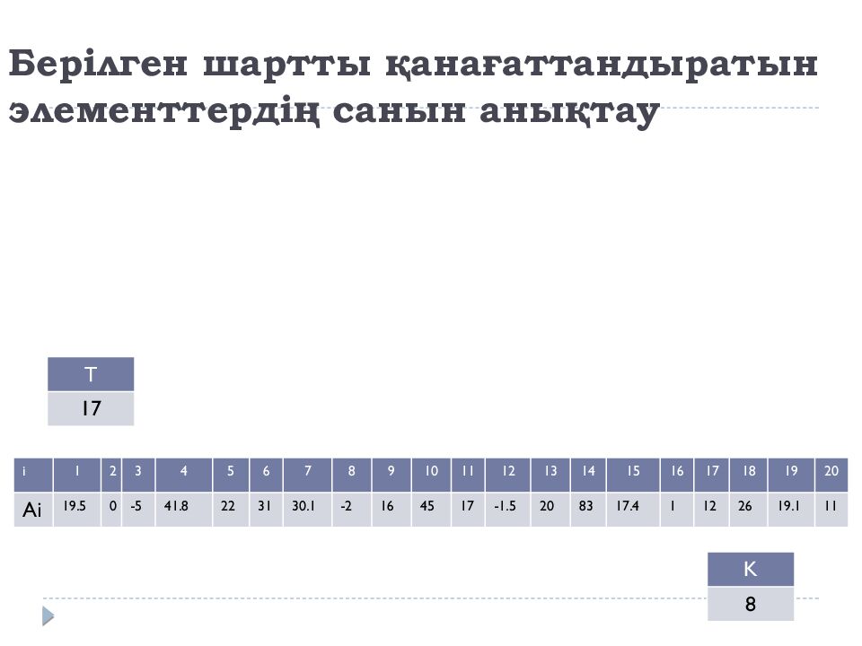 Слайд 13: Берілген шартты қанағаттандыратын элементтердің санын анықтау