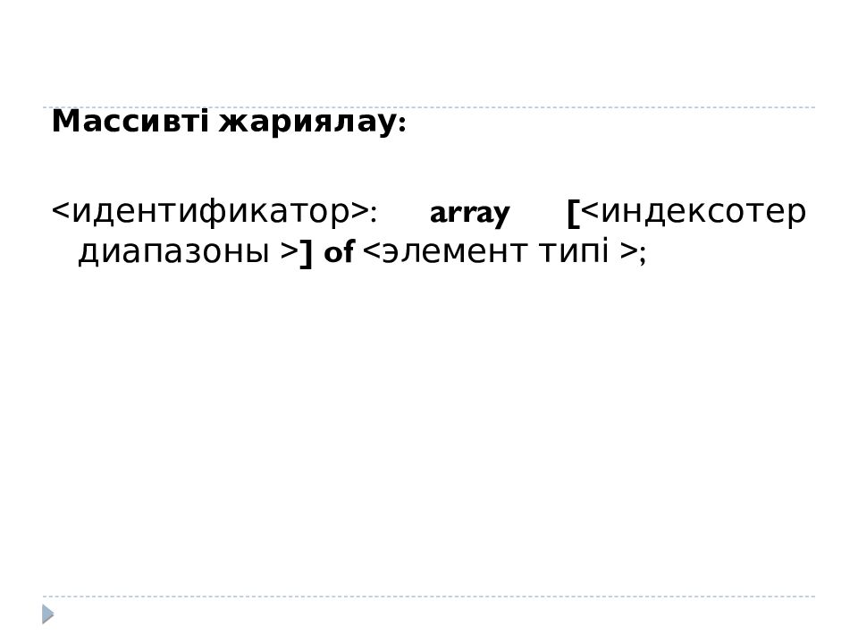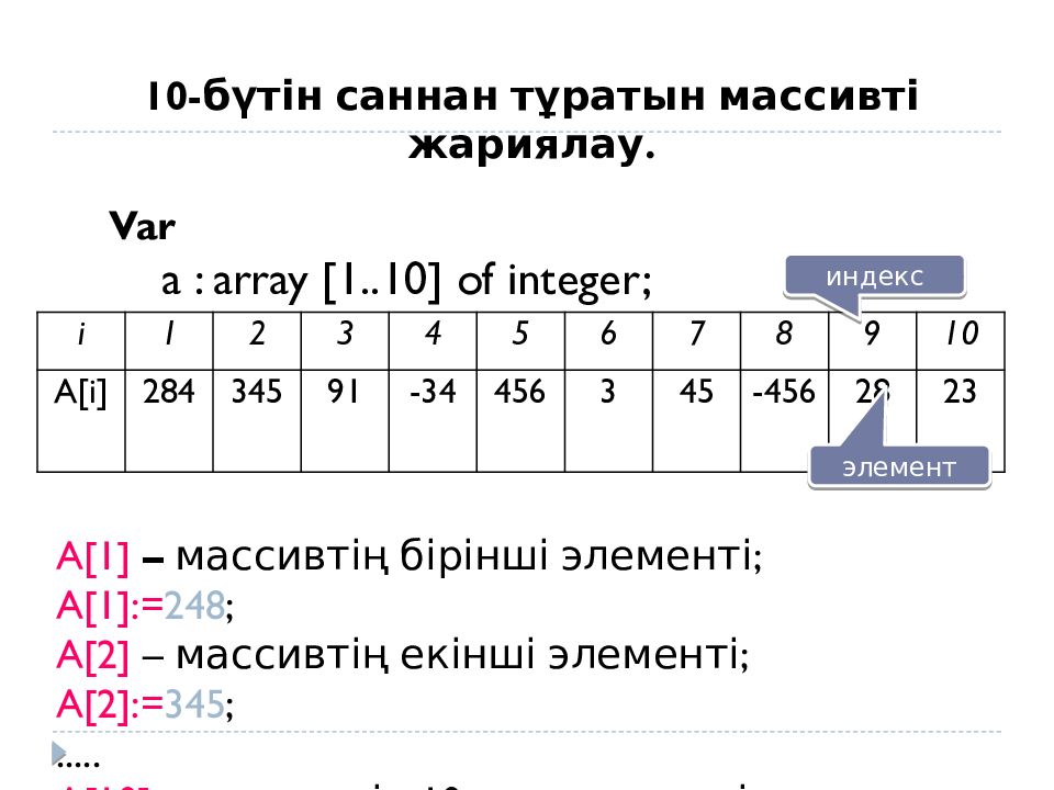 i 1 2 3 4 5 6 7 8 9 10 A[ i ] 284 345 91 -34 456 3 45 -456 28 23 10-бүтін саннан тұратын массивті жариялау. Var a : array [1..10] of integer; индекс элемент A [1] – массивтің бірінші элементі ; A [1 ]:= 248 ; A [2] – массивтің екінші элементі ; A [2 ]:= 345 ; ..... A [ 10 ] – массивтің 10-шы элементі. A [ 10 ]:= 23 ;