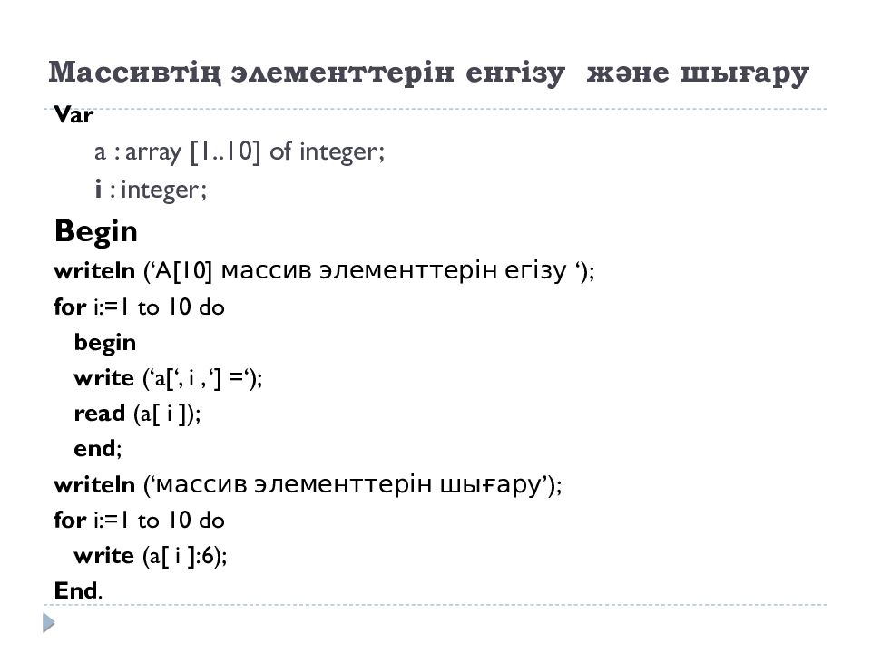 Var a : array [1..10] of integer; i : integer; Begin writeln ( ‘ A[ 10] массив элементтерін егізу ‘ ); for i :=1 to 10 do begin write (‘a[‘, i, ‘] =‘); read (a[ i ]); end ; writeln ( ‘ массив элементтерін шығару ’ ); for i :=1 to 10 do write (a[ i ]:6); End.