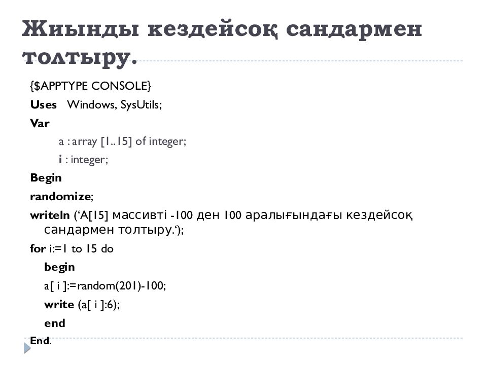 {$APPTYPE CONSOLE} Uses Windows, SysUtils ; Var a : array [1..15] of integer; i : integer; Begin randomize ; writeln ( ‘ A[ 15 ] массивті - 100 ден 100 аралығындағы кездейсоқ сандармен толтыру. ‘ ); for i :=1 to 15 do begin a[ i ]:=random(201)-100; write (a[ i ]:6); end End.