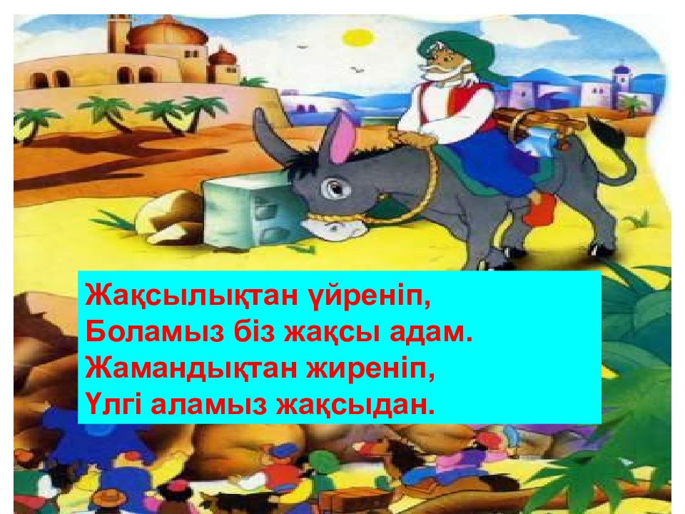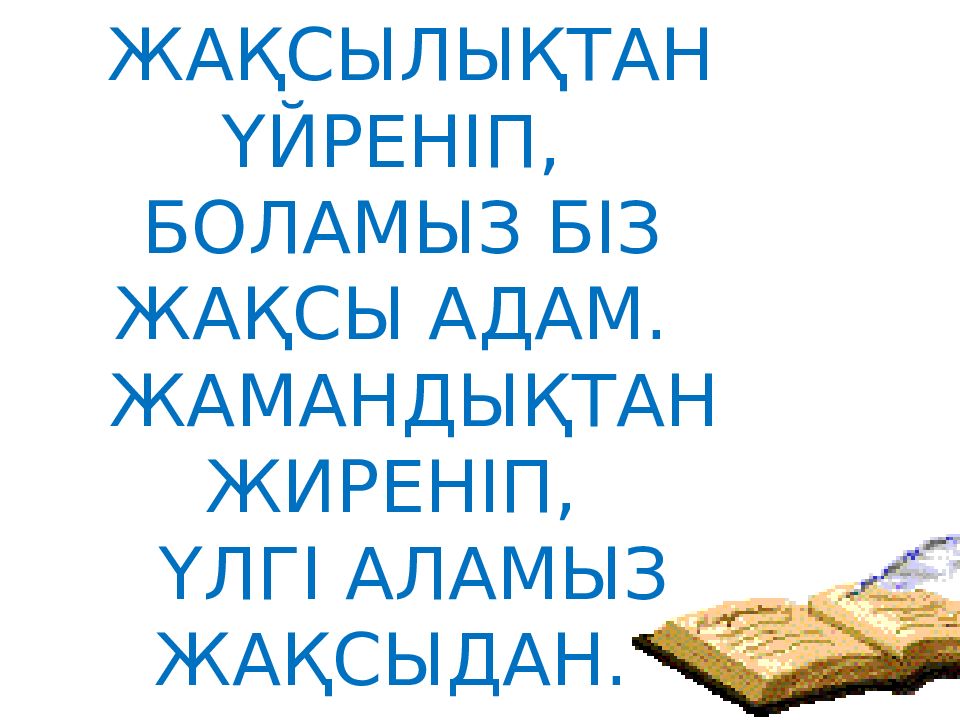 ЖАҚСЫЛЫҚТАН ҮЙРЕНІП, БОЛАМЫЗ БІЗ ЖАҚСЫ АДАМ. ЖАМАНДЫҚТАН ЖИРЕНІП, ҮЛГІ АЛАМЫЗ ЖАҚСЫДАН.