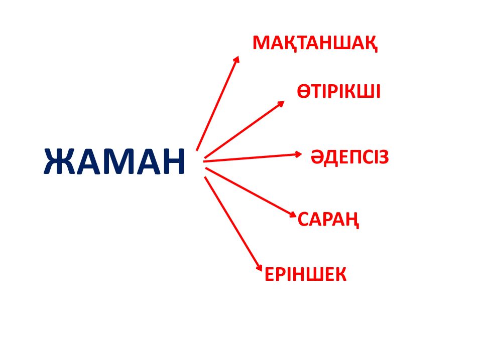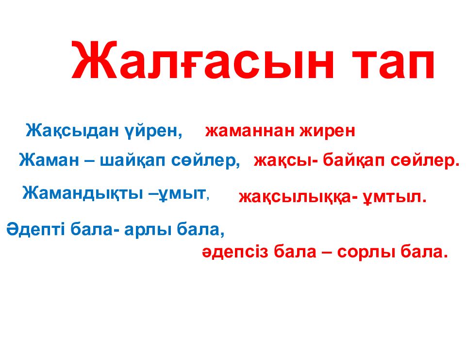 Жалғасын тап Жақсыдан үйрен, жаманнан жирен Жаман – шайқап сөйлер, жақсы- байқап сөйлер. Жамандықты –ұмыт, жақсылыққа- ұмтыл. Әдепті бала- арлы бала, әдепсіз бала – сорлы бала.