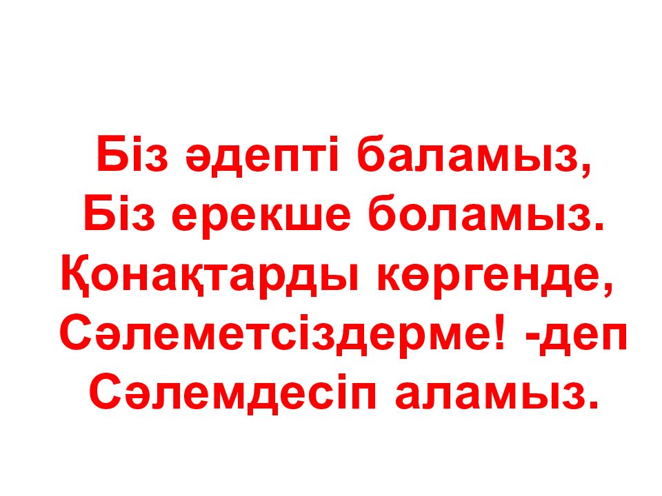 Біз әдепті баламыз, Біз ерекше боламыз. Қонақтарды көргенде, Сәлеметсіздерме! -деп Сәлемдесіп аламыз.