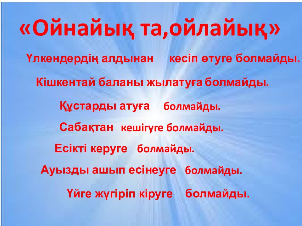 «Ойнайық та,ойлайық» Үлкендердің алдынан кесіп өтуге болмайды. Кішкентай баланы жылатуға болмайды. Құстарды атуға болмайды. Сабақтан кешігуге болмайды. Есікті керуге болмайды. Ауызды ашып есінеуге болмайды. Үйге жүгіріп кіруге болмайды.