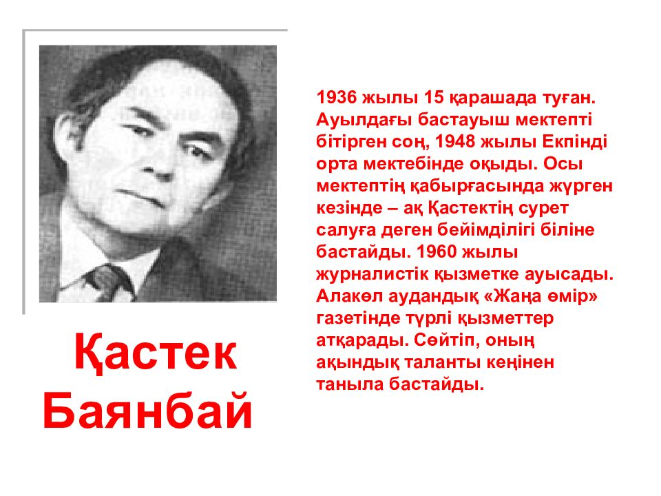 1936 жылы 15 қарашада туған. Ауылдағы бастауыш мектепті бітірген соң, 1948 жылы Екпінді орта мектебінде оқыды. Осы мектептің қабырғасында жүрген кезінде – ақ Қастектің сурет салуға деген бейімділігі біліне бастайды. 1960 жылы журналистік қызметке ауысады. Алакөл аудандық «Жаңа өмір» газетінде түрлі қызметтер атқарады. Сөйтіп, оның ақындық таланты кеңінен таныла бастайды. Қастек Баянбай