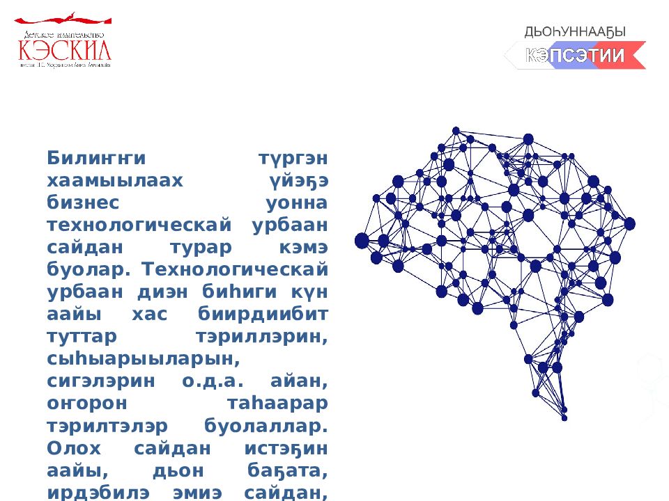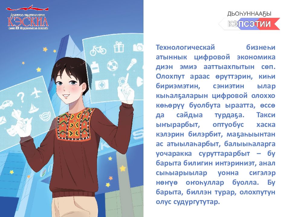 Технологическай бизнеһи атыннык цифровой экономика диэн эмиэ ааттыахпытын сөп. Олохпут араас өрүттэрин, киһи бириэмэтин, сэниэтин ылар кыһалҕаларын цифровой олоххо көһөрүү буолбута ыраатта, өссө да сайдыа турдаҕа. Такси ыҥырарбыт, оптуобус хаска кэлэрин билэрбит, маҕаһыынтан ас атыылаһарбыт, балыыһаларга уочаракка суруттарарбыт – бу барыта билигин интэриниэт, анал сыһыарыылар уонна сигэлэр нөҥүө оҥоһуллар буолла. Бу барыта, биллэн турар, олохпутун олус судургутутар.