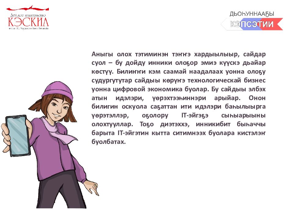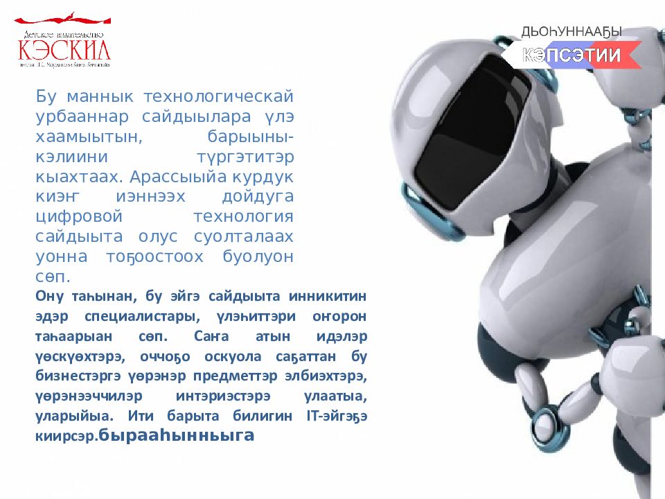 Аныгы олох тэтиминэн тэҥҥэ хардыылыыр, сайдар суол – бу дойду инники олоҕор эмиэ күүскэ дьайар көстүү. Билиҥҥи кэм саамай наадалаах уонна олоҕу судургутутар сайдыы көрүҥэ технологическай бизнес уонна цифровой экономика буолар. Бу сайдыы элбэх атын идэлэри, үөрэхтээһиннэри арыйар. Онон билигин оскуола саҕаттан ити идэлэри баһылыырга үөрэтэллэр, оҕолору IT-эйгэҕэ сыһыарыыны олохтууллар. Тоҕо диэтэххэ, инникибит быһаччы барыта IT-эйгэтин кытта ситимнээх буолара кистэлэҥ буолбатах.