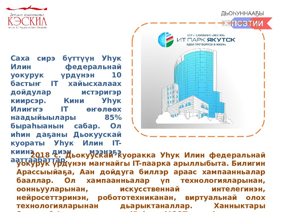 Саха сирэ бүттүүн Уһук Илин федеральнай уокурук үрдүнэн 10 бастыҥ IT хайысхалаах дойдулар истэригэр киирсэр. Кини Уһук Илиҥҥэ IT өҥөлөөх наадыйыылары 85% быраһыанын сабар. Ол иһин даҕаны Дьокуускай куораты Уһук Илин IT-киинэ диэн мээнэҕэ ааттаабаттар. 2018 с. Дьокуускай куоракка Уһук Илин федеральнай уокурук үрдүнэн маҥнайгы IT-паарка арыллыбыта. Билигин Арассыыйаҕа, Аан дойдуга биллэр араас хампаанньалар бааллар. Ол хампаанньалар үп технологияларынан, оонньууларынан, искусственнай интелегинэн, нейросеттэринэн, робототехниканан, виртуальнай олох технологияларынан дьарыктаналлар. Ханныктары билэҕит? Ааттаталааҥ эрэ. ( Drivee, MOST о.д.а. )