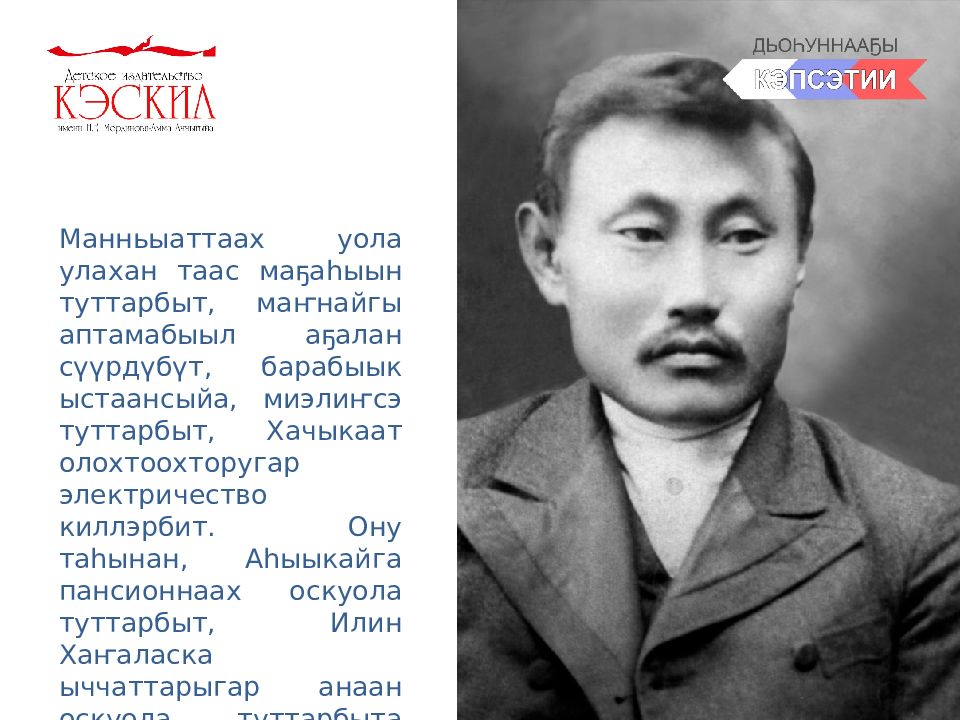 Манньыаттаах уола улахан таас маҕаһыын туттарбыт, маҥнайгы аптамабыыл аҕалан сүүрдүбүт, барабыык ыстаансыйа, миэлиҥсэ туттарбыт, Хачыкаат олохтоохторугар электричество киллэрбит. Ону таһынан, Аһыыкайга пансионнаах оскуола туттарбыт, Илин Хаҥаласка ыччаттарыгар анаан оскуола туттарбыта биллэр.