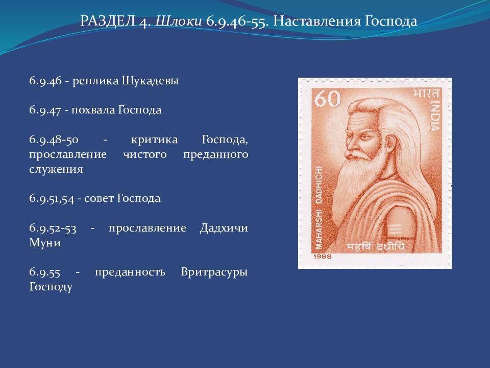 РАЗДЕЛ 4. Шлоки 6.9.46-55. Наставления Господа 6.9.46 - реплика Шукадевы 6.9.47 - похвала Господа 6.9.48-50 - критика Господа, прославление чистого преданного служения 6.9.51,54 - совет Господа 6.9.52-53 - прославление Дадхичи Муни 6.9.55 - преданность Вритрасуры Господу