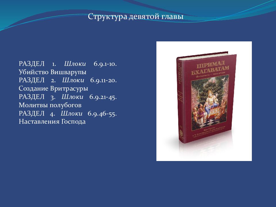 РАЗДЕЛ 1. Шлоки 6.9.1-10. Убийство Вишварупы РАЗДЕЛ 2. Шлоки 6.9.11-20. Создание Вритрасуры РАЗДЕЛ 3. Шлоки 6.9.21-45. Молитвы полубогов РАЗДЕЛ 4. Шлоки 6.9.46-55. Наставления Господа Структура девятой главы