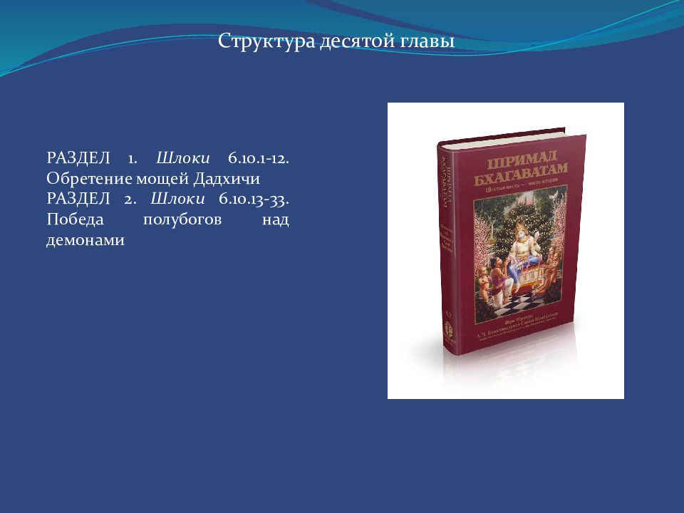 РАЗДЕЛ 1. Шлоки 6.10.1-12. Обретение мощей Дадхичи РАЗДЕЛ 2. Шлоки 6.10.13-33. Победа полубогов над демонами Структура десятой главы