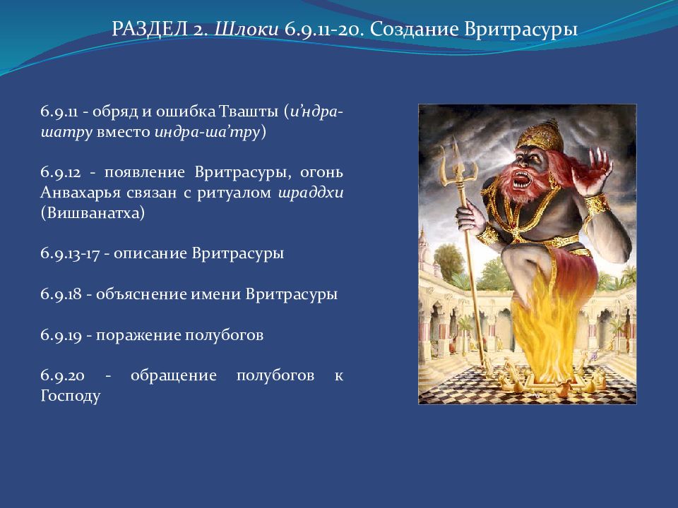 РАЗДЕЛ 2. Шлоки 6.9.11-20. Создание Вритрасуры 6.9.11 - обряд и ошибка Твашты ( и ’ ндра-шатру вместо индра-ша ’ тру ) 6.9.12 - появление Вритрасуры, огонь Анвахарья связан с ритуалом шраддхи (Вишванатха) 6.9.13-17 - описание Вритрасуры 6.9.18 - объяснение имени Вритрасуры 6.9.19 - поражение полубогов 6.9.20 - обращение полубогов к Господу