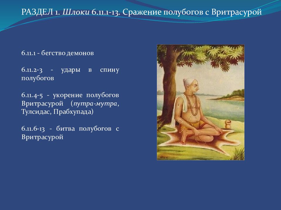 РАЗДЕЛ 1. Шлоки 6.11.1-13. Сражение полубогов с Вритрасурой 6.11.1 - бегство демонов 6.11.2-3 - удары в спину полубогов 6.11.4-5 - укорение полубогов Вритрасурой ( путра-мутра, Тулсидас, Прабхупада) 6.11.6-13 - битва полубогов с Вритрасурой