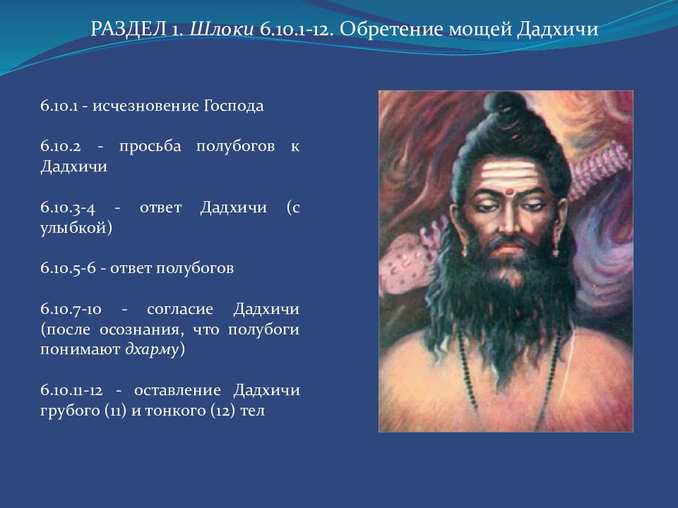 РАЗДЕЛ 1. Шлоки 6.10.1-12. Обретение мощей Дадхичи 6.10.1 - исчезновение Господа 6.10.2 - просьба полубогов к Дадхичи 6.10.3-4 - ответ Дадхичи (с улыбкой) 6.10.5-6 - ответ полубогов 6.10.7-10 - согласие Дадхичи (после осознания, что полубоги понимают дхарму ) 6.10.11-12 - оставление Дадхичи грубого (11) и тонкого (12) тел