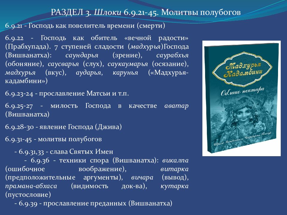РАЗДЕЛ 3. Шлоки 6.9.21-45. Молитвы полубогов 6.9.21 - Господь как повелитель времени (смерти) 6.9.22 - Господь как обитель «вечной радости» (Прабхупада). 7 ступеней сладости ( мадхурья )Господа (Вишванатха): саундарья (зрение), саурабхья (обоняние), саусварья (слух), саукаумарья (осязание), мадхурья (вкус), аударья, карунья («Мадхурья-кадамбини») 6.9.23-24 - прославление Матсьи и т.п. 6.9.25-27 - милость Господа в качестве аватар (Вишванатха) 6.9.28-30 - явление Господа (Джива) 6.9.31-45 - молитвы полубогов - 6.9.31,33 - слава Святых Имен - 6.9.36 - техники спора (Вишванатха): викалпа (ошибочное воображение), витарка (предположительные аргументы), вичара (вывод), прамана-абхаса (видимость док-ва), кутарка (пустословие) - 6.9.39 - прославление преданных (Вишванатха)