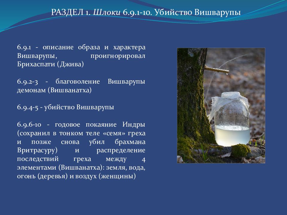 РАЗДЕЛ 1. Шлоки 6.9.1-10. Убийство Вишварупы 6.9.1 - описание образа и характера Вишварупы, проигнорировал Брихаспати (Джива) 6.9.2-3 - благоволение Вишварупы демонам (Вишванатха) 6.9.4-5 - убийство Вишварупы 6.9.6-10 - годовое покаяние Индры (сохранил в тонком теле «семя» греха и позже снова убил брахмана Вритрасуру) и распределение последствий греха между 4 элементами (Вишванатха): земля, вода, огонь (деревья) и воздух (женщины)