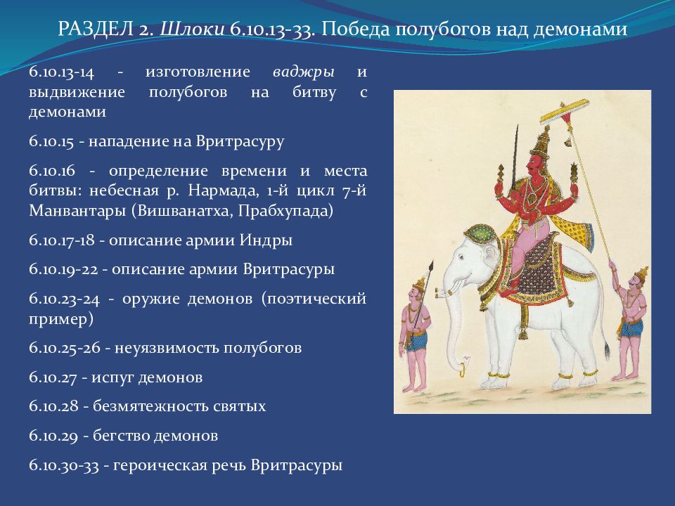 РАЗДЕЛ 2. Шлоки 6.10.13-33. Победа полубогов над демонами 6.10.13-14 - изготовление ваджры и выдвижение полубогов на битву с демонами 6.10.15 - нападение на Вритрасуру 6.10.16 - определение времени и места битвы: небесная р. Нармада, 1-й цикл 7-й Манвантары (Вишванатха, Прабхупада) 6.10.17-18 - описание армии Индры 6.10.19-22 - описание армии Вритрасуры 6.10.23-24 - оружие демонов (поэтический пример) 6.10.25-26 - неуязвимость полубогов 6.10.27 - испуг демонов 6.10.28 - безмятежность святых 6.10.29 - бегство демонов 6.10.30-33 - героическая речь Вритрасуры