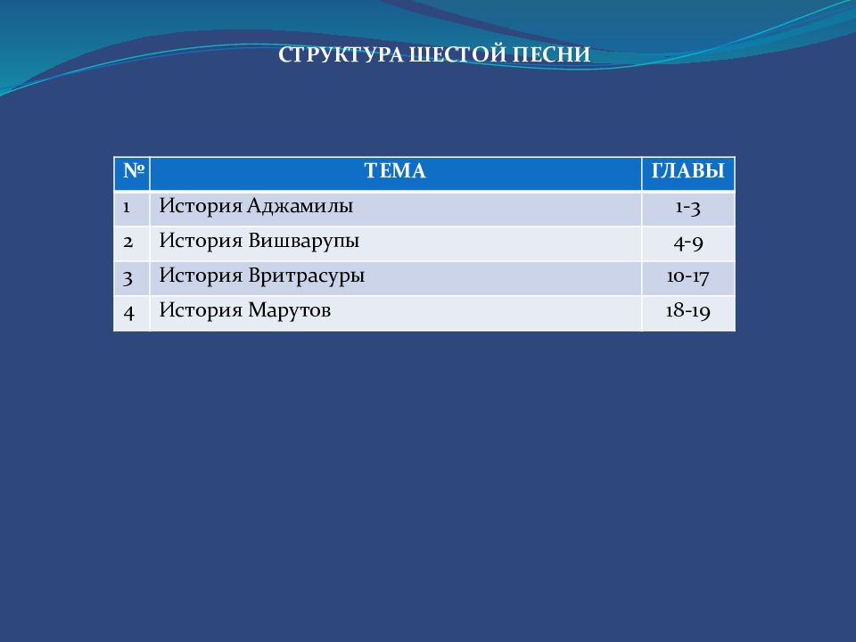 № ТЕМА ГЛАВЫ 1 История Аджамилы 1-3 2 История Вишварупы 4-9 3 История Вритрасуры 10-17 4 История Марутов 18-19 СТРУКТУРА ШЕСТОЙ ПЕСНИ