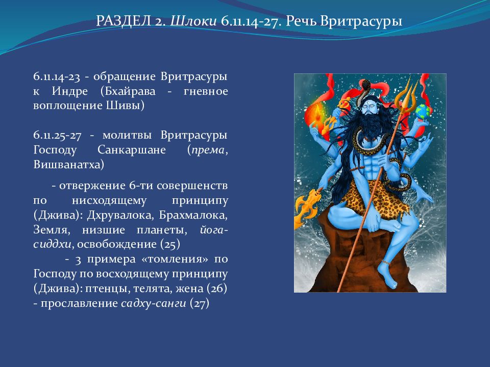 РАЗДЕЛ 2. Шлоки 6.11.14-27. Речь Вритрасуры 6.11.14-23 - обращение Вритрасуры к Индре (Бхайрава - гневное воплощение Шивы) 6.11.25-27 - молитвы Вритрасуры Господу Санкаршане ( према, Вишванатха) - отвержение 6-ти совершенств по нисходящему принципу (Джива): Дхрувалока, Брахмалока, Земля, низшие планеты, йога-сиддхи, освобождение (25) - 3 примера «томления» по Господу по восходящему принципу (Джива): птенцы, телята, жена (26) - прославление садху-санги (27)
