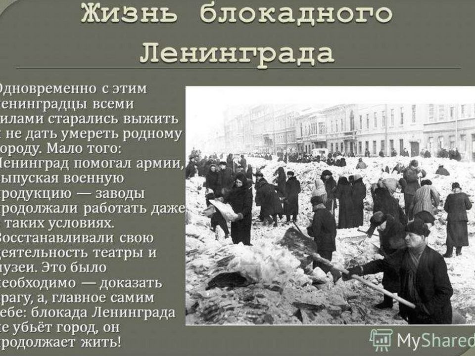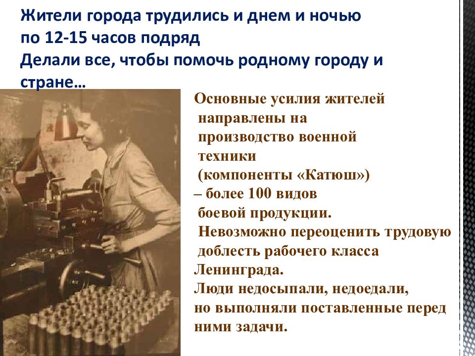 Жители города трудились и днем и ночью по 12-15 часов подряд Делали все, чтобы помочь родному городу и стране… Основные усилия жителей направлены на производство военной техники (компоненты «Катюш») – более 100 видов боевой продукции. Невозможно переоценить трудовую доблесть рабочего класса Ленинграда. Люди недосыпали, недоедали, но выполняли поставленные перед ними задачи.