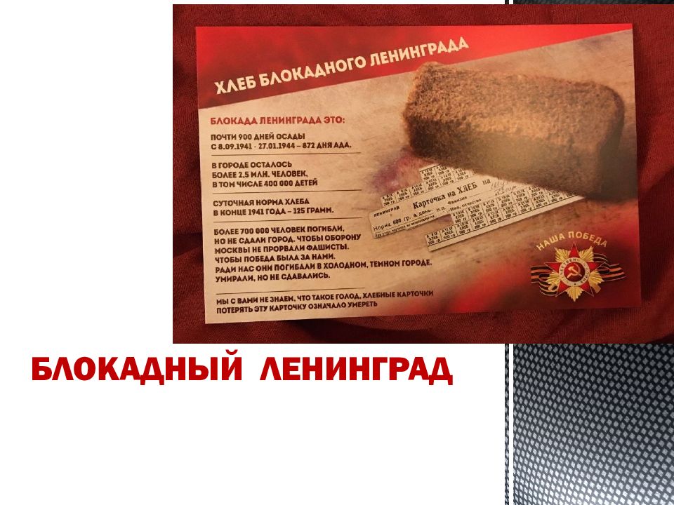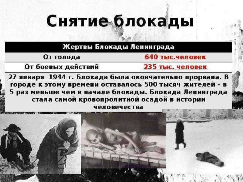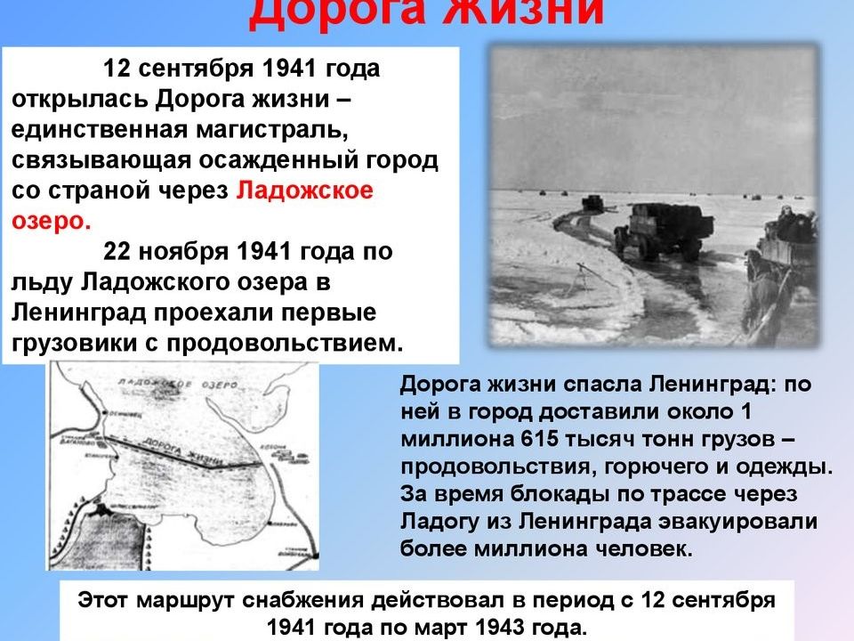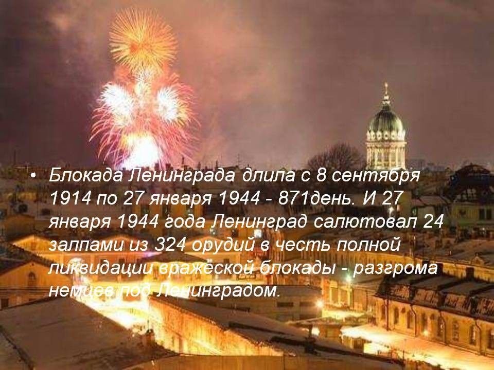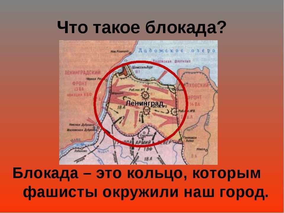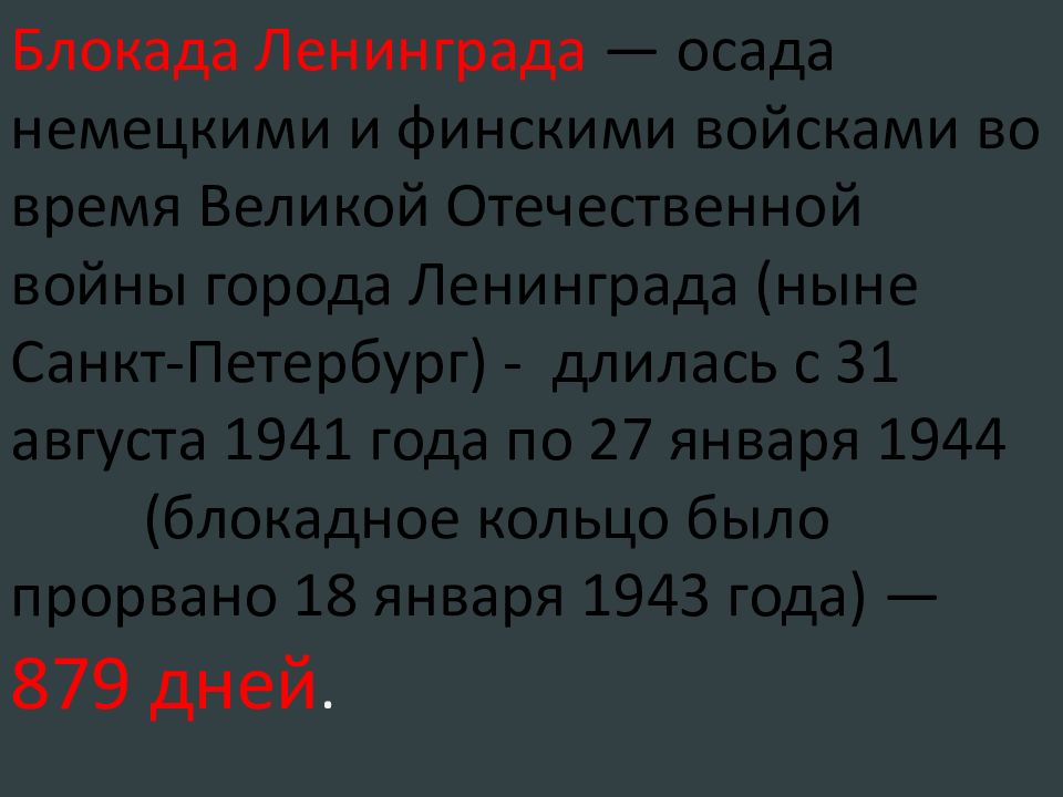 Блокада Ленинграда — осада немецкими и финскими войсками во время Великой Отечественной войны города Ленинграда (ныне Санкт-Петербург) - длилась с 31 августа 1941 года по 27 января 1944 (блокадное кольцо было прорвано 18 января 1943 года) — 879 дней.