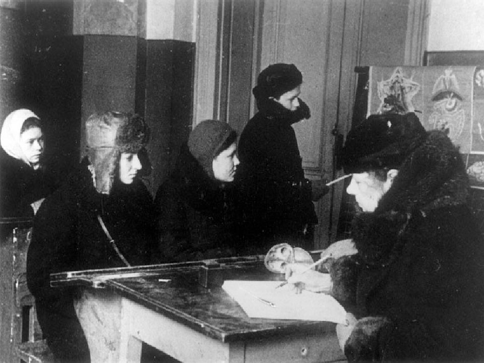 Во время блокады поощрялись хорошие отношения между бойцами и мирным населением. Посещение раненых в госпиталях считалось очень важным делом. Эта девочка, одетая в свое лучшее платье и очень здоровая на вид, раздает в госпитальной палате письма раненым.
