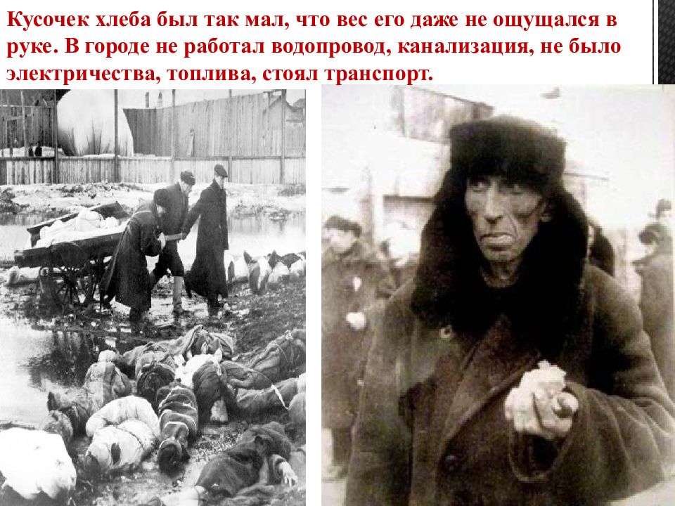 Кусочек хлеба был так мал, что вес его даже не ощущался в руке. В городе не работал водопровод, канализация, не было электричества, топлива, стоял транспорт.