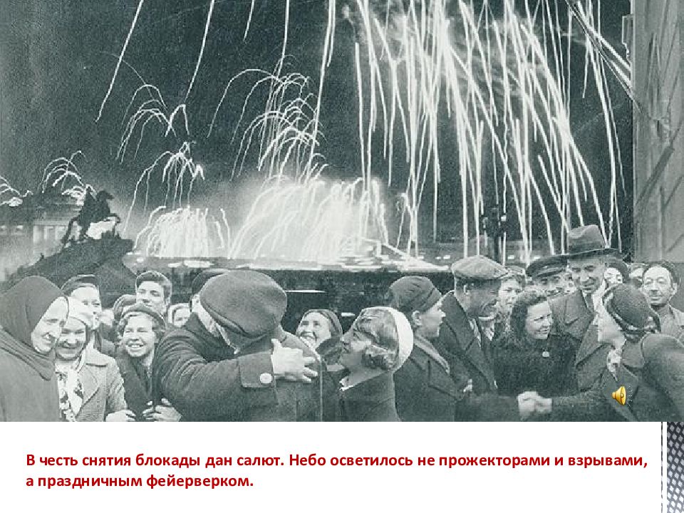 В честь снятия блокады дан салют. Небо осветилось не прожекторами и взрывами, а праздничным фейерверком.