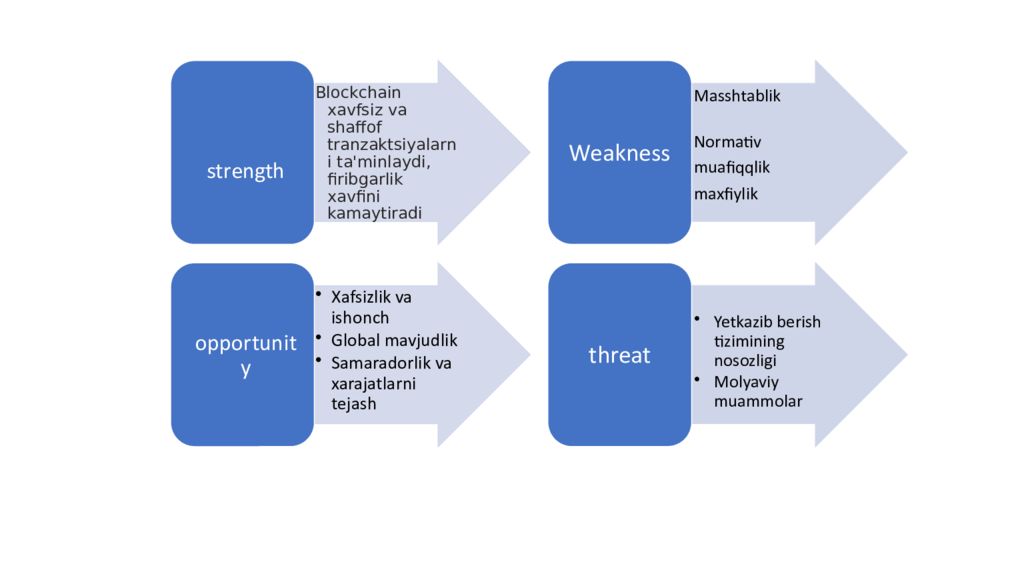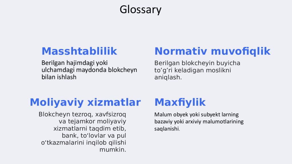 Glossary Masshtablilik Berilgan hajimdagi yoki ulchamdagi maydonda blokcheyn bilan ishlash Normativ muvofiqlik Berilgan blokcheyin buyicha to’g’ri keladigan moslikni aniqlash. Moliyaviy xizmatlar Blokcheyn tezroq, xavfsizroq va tejamkor moliyaviy xizmatlarni taqdim etib, bank, to‘lovlar va pul o‘tkazmalarini inqilob qilishi mumkin. Maxfiylik Malum obyek yoki subyekt larning bazaviy yoki arxiviy malumotlarining saqlanishi.