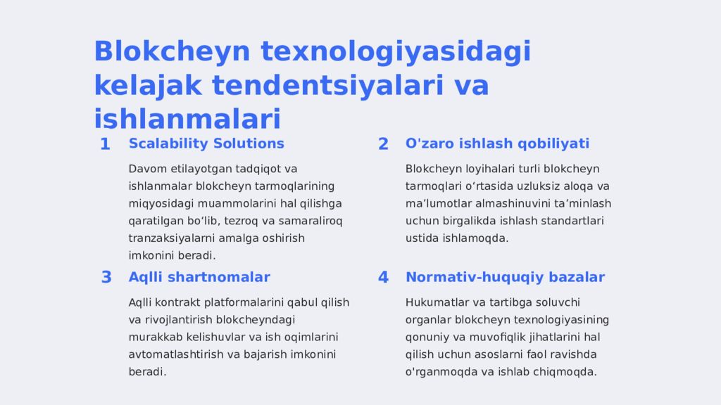 Blokcheyn texnologiyasidagi kelajak tendentsiyalari va ishlanmalari 1 Scalability Solutions Davom etilayotgan tadqiqot va ishlanmalar blokcheyn tarmoqlarining miqyosidagi muammolarini hal qilishga qaratilgan bo‘lib, tezroq va samaraliroq tranzaksiyalarni amalga oshirish imkonini beradi. 2 O'zaro ishlash qobiliyati Blokcheyn loyihalari turli blokcheyn tarmoqlari o‘rtasida uzluksiz aloqa va ma’lumotlar almashinuvini ta’minlash uchun birgalikda ishlash standartlari ustida ishlamoqda. 3 Aqlli shartnomalar Aqlli kontrakt platformalarini qabul qilish va rivojlantirish blokcheyndagi murakkab kelishuvlar va ish oqimlarini avtomatlashtirish va bajarish imkonini beradi. 4 Normativ-huquqiy bazalar Hukumatlar va tartibga soluvchi organlar blokcheyn texnologiyasining qonuniy va muvofiqlik jihatlarini hal qilish uchun asoslarni faol ravishda o'rganmoqda va ishlab chiqmoqda.