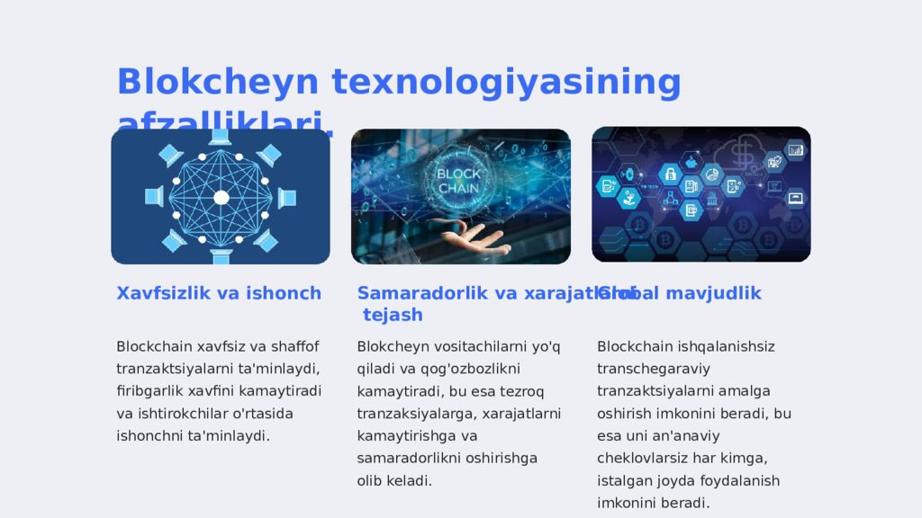 Blokcheyn texnologiyasining afzalliklari. Xavfsizlik va ishonch Blockchain xavfsiz va shaffof tranzaktsiyalarni ta'minlaydi, firibgarlik xavfini kamaytiradi va ishtirokchilar o'rtasida ishonchni ta'minlaydi. Samaradorlik va xarajatlarni tejash Blokcheyn vositachilarni yo'q qiladi va qog'ozbozlikni kamaytiradi, bu esa tezroq tranzaksiyalarga, xarajatlarni kamaytirishga va samaradorlikni oshirishga olib keladi. Global mavjudlik Blockchain ishqalanishsiz transchegaraviy tranzaktsiyalarni amalga oshirish imkonini beradi, bu esa uni an'anaviy cheklovlarsiz har kimga, istalgan joyda foydalanish imkonini beradi.
