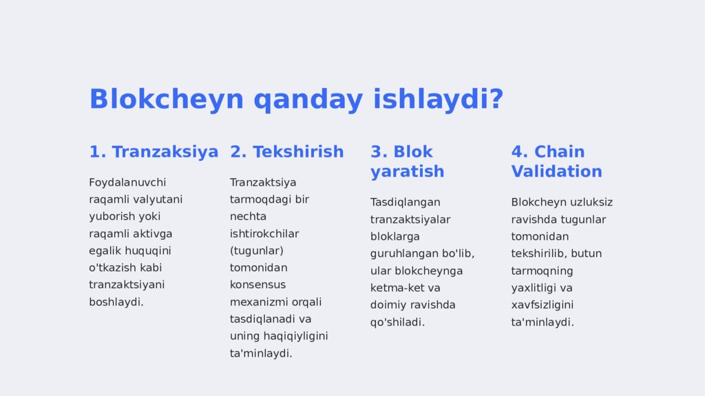 Blokcheyn qanday ishlaydi ? 1. Tranzaksiya Foydalanuvchi raqamli valyutani yuborish yoki raqamli aktivga egalik huquqini o'tkazish kabi tranzaktsiyani boshlaydi. 2. Tekshirish Tranzaktsiya tarmoqdagi bir nechta ishtirokchilar ( tugunlar ) tomonidan konsensus mexanizmi orqali tasdiqlanadi va uning haqiqiyligini ta'minlaydi. 3. Blok yaratish Tasdiqlangan tranzaktsiyalar bloklarga guruhlangan bo'lib, ular blokcheynga ketma-ket va doimiy ravishda qo'shiladi. 4. Chain Validation Blokcheyn uzluksiz ravishda tugunlar tomonidan tekshirilib, butun tarmoqning yaxlitligi va xavfsizligini ta'minlaydi.