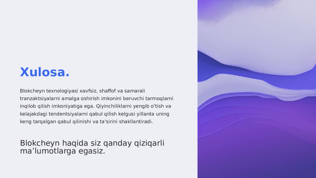 Xulosa. Blokcheyn texnologiyasi xavfsiz, shaffof va samarali tranzaktsiyalarni amalga oshirish imkonini beruvchi tarmoqlarni inqilob qilish imkoniyatiga ega. Qiyinchiliklarni yengib o'tish va kelajakdagi tendentsiyalarni qabul qilish kelgusi yillarda uning keng tarqalgan qabul qilinishi va ta'sirini shakllantiradi. Blokcheyn haqida siz qanday qiziqarli ma’lumotlarga egasiz.