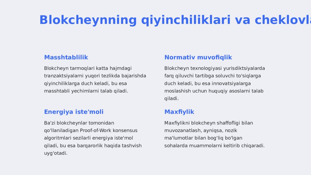 Blokcheynning qiyinchiliklari va cheklovlari. Masshtablilik Blokcheyn tarmoqlari katta hajmdagi tranzaktsiyalarni yuqori tezlikda bajarishda qiyinchiliklarga duch keladi, bu esa masshtabli yechimlarni talab qiladi. Normativ muvofiqlik Blokcheyn texnologiyasi yurisdiktsiyalarda farq qiluvchi tartibga soluvchi to'siqlarga duch keladi, bu esa innovatsiyalarga moslashish uchun huquqiy asoslarni talab qiladi. Energiya iste'moli Ba'zi blokcheynlar tomonidan qo'llaniladigan Proof-of-Work konsensus algoritmlari sezilarli energiya iste'mol qiladi, bu esa barqarorlik haqida tashvish uyg'otadi. Maxfiylik Maxfiylikni blokcheyn shaffofligi bilan muvozanatlash, ayniqsa, nozik ma'lumotlar bilan bog'liq bo'lgan sohalarda muammolarni keltirib chiqaradi.