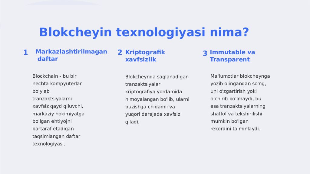 Blokcheyin texnologiyasi nima ? 1 Markazlashtirilmagan daftar Blockchain - bu bir nechta kompyuterlar bo'ylab tranzaktsiyalarni xavfsiz qayd qiluvchi, markaziy hokimiyatga bo'lgan ehtiyojni bartaraf etadigan taqsimlangan daftar texnologiyasi. 2 Kriptografik xavfsizlik Blokcheynda saqlanadigan tranzaktsiyalar kriptografiya yordamida himoyalangan bo'lib, ularni buzishga chidamli va yuqori darajada xavfsiz qiladi. 3 Immutable va Transparent Ma'lumotlar blokcheynga yozib olingandan so'ng, uni o'zgartirish yoki o'chirib bo'lmaydi, bu esa tranzaktsiyalarning shaffof va tekshirilishi mumkin bo'lgan rekordini ta'minlaydi.