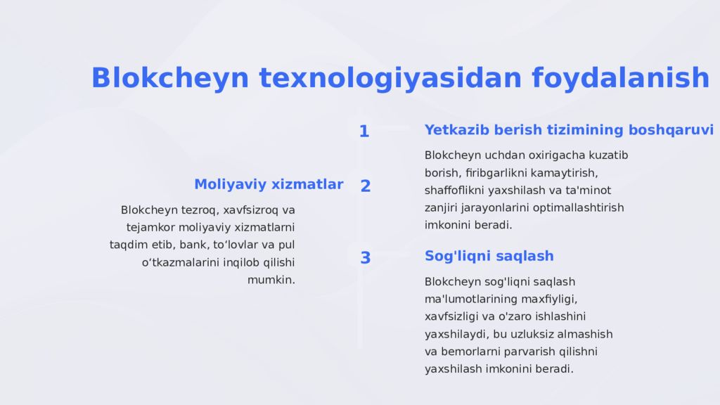 Blokcheyn texnologiyasidan foydalanish holatlari. 1 Yetkazib berish tizimining boshqaruvi Blokcheyn uchdan oxirigacha kuzatib borish, firibgarlikni kamaytirish, shaffoflikni yaxshilash va ta'minot zanjiri jarayonlarini optimallashtirish imkonini beradi. 2 Moliyaviy xizmatlar Blokcheyn tezroq, xavfsizroq va tejamkor moliyaviy xizmatlarni taqdim etib, bank, to‘lovlar va pul o‘tkazmalarini inqilob qilishi mumkin. 3 Sog'liqni saqlash Blokcheyn sog'liqni saqlash ma'lumotlarining maxfiyligi, xavfsizligi va o'zaro ishlashini yaxshilaydi, bu uzluksiz almashish va bemorlarni parvarish qilishni yaxshilash imkonini beradi.