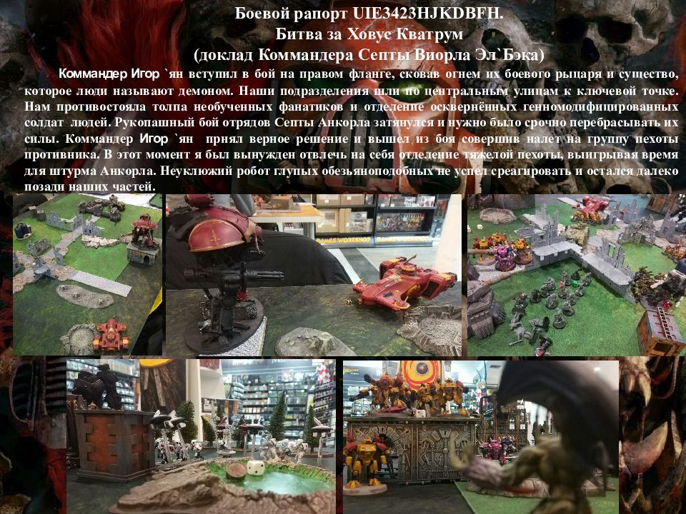 Коммандер Игор ` ян вступил в бой на правом фланге, сковав огнем их боевого рыцаря и существо, которое люди называют демоном. Наши подразделения шли по центральным улицам к ключевой точке. Нам противостояла толпа необученных фанатиков и отделение осквернённых генномодифицированных солдат людей. Рукопашный бой отрядов Септы Анкорла затянулся и нужно было срочно перебрасывать их силы. Коммандер Игор ` ян прнял верное решение и вышел из боя совершив налет на группу пехоты противника. В этот момент я был вынужден отвлечь на себя отделение тяжелой пехоты, выигрывая время для штурма Анкорла. Неуклюжий робот глупых обезьяноподобных не успел среагировать и остался далеко позади наших частей. Боевой рапорт UIE3423HJKDBFH. Битва за Ховус Кватрум (доклад Коммандера Септы Виорла Эл ` Бэка)