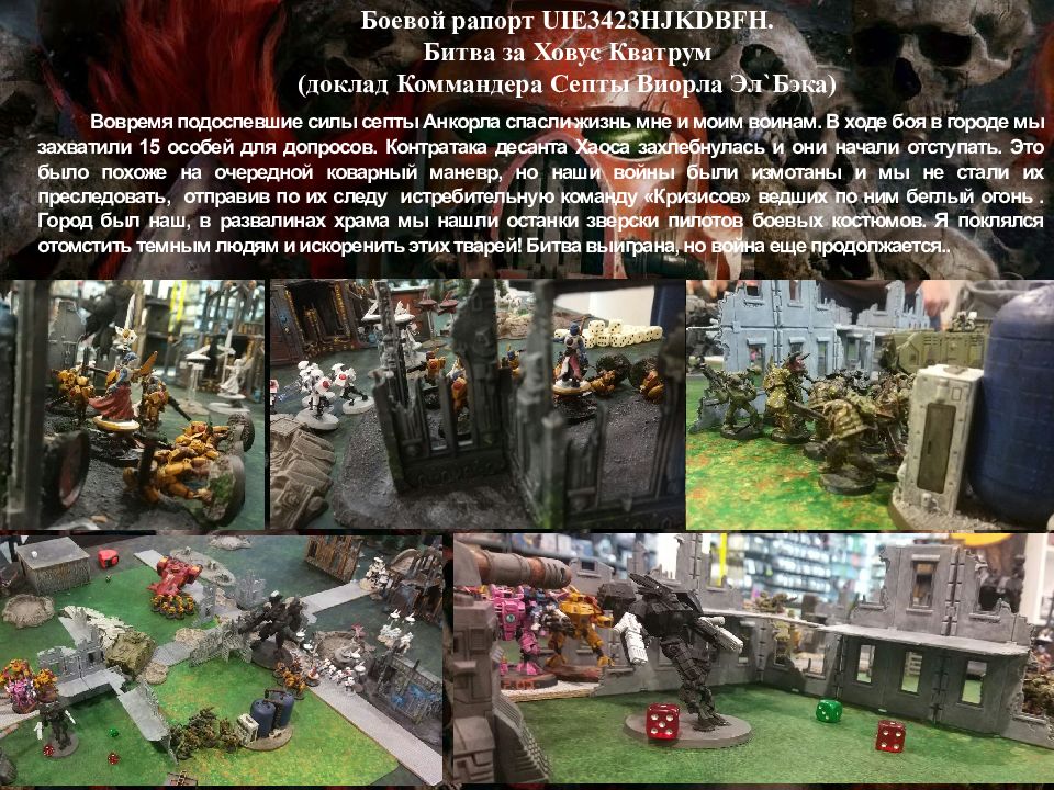 Вовремя подоспевшие силы септы Анкорла спасли жизнь мне и моим воинам. В ходе боя в городе мы захватили 15 особей для допросов. Контратака десанта Хаоса захлебнулась и они начали отступать. Это было похоже на очередной коварный маневр, но наши войны были измотаны и мы не стали их преследовать, отправив по их следу истребительную команду «Кризисов» ведших по ним беглый огонь. Город был наш, в развалинах храма мы нашли останки зверски пилотов боевых костюмов. Я поклялся отомстить темным людям и искоренить этих тварей! Битва выиграна, но война еще продолжается.. Боевой рапорт UIE3423HJKDBFH. Битва за Ховус Кватрум (доклад Коммандера Септы Виорла Эл ` Бэка)