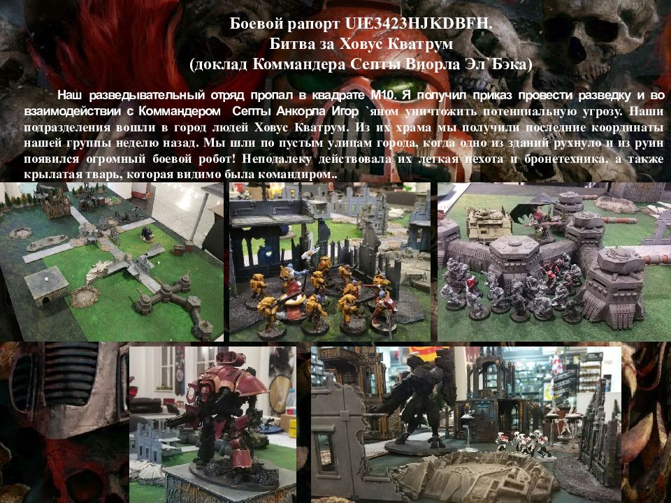 Боевой рапорт UIE3423HJKDBFH. Битва за Ховус Кватрум (доклад Коммандера Септы Виорла Эл ` Бэка) Наш разведывательный отряд пропал в квадрате М10. Я получил приказ провести разведку и во взаимодействии с Коммандером Септы Анкорла Игор ` яном уничтожить потенциальную угрозу. Наши подразделения вошли в город людей Ховус Кватрум. Из их храма мы получили последние координаты нашей группы неделю назад. Мы шли по пустым улицам города, когда одно из зданий рухнуло и из руин появился огромный боевой робот! Неподалеку действовала их легкая пехота и бронетехника, а также крылатая тварь, которая видимо была командиром..