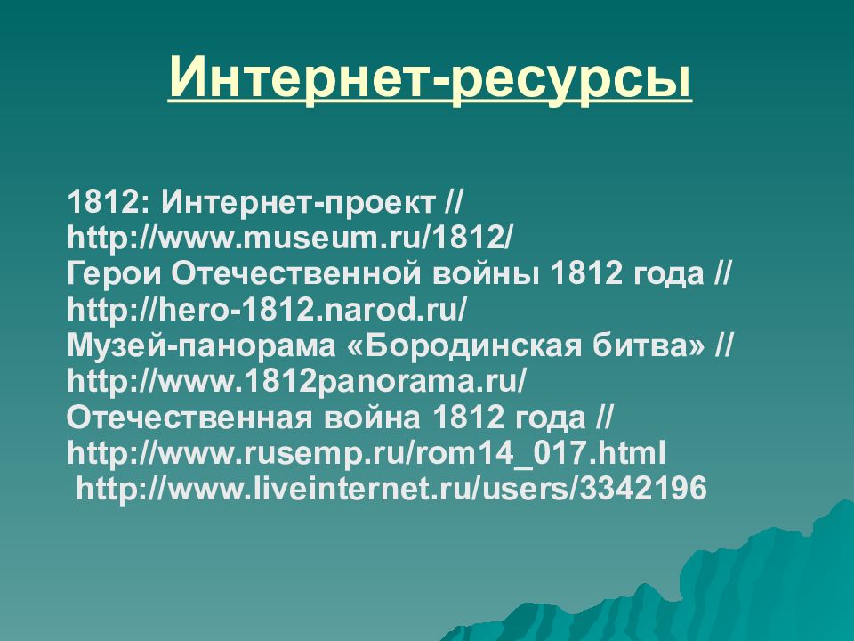 1812: Интернет-проект // http://www.museum.ru/1812/ Герои Отечественной войны 1812 года // http://hero-1812.narod.ru/ Музей-панорама «Бородинская битва» // http://www.1812panorama.ru/ Отечественная война 1812 года // http://www.rusemp.ru/rom14_017.html http://www. liveinternet.ru/users/3342196