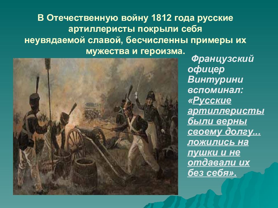Французский офицер Винтурини вспоминал: « Русские артиллеристы были верны своему долгу... ложились на пушки и не отдавали их без себя». В Отечественную войну 1812 года русские артиллеристы покрыли себя неувядаемой славой, бесчисленны примеры их мужества и героизма.