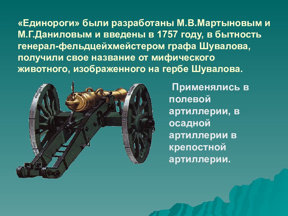 Применялись в полевой артиллерии, в осадной артиллерии в крепостной артиллерии. «Единороги» были разработаны М.В.Мартыновым и М.Г.Даниловым и введены в 1757 году, в бытность генерал-фельдцейхмейстером графа Шувалова, получили свое название от мифического животного, изображенного на гербе Шувалова.