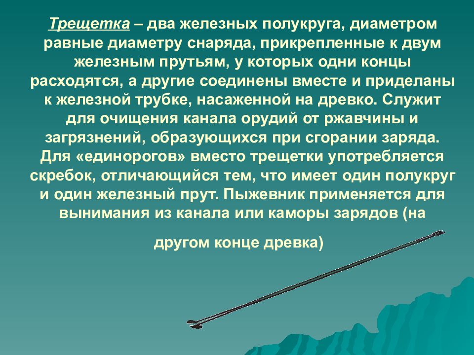 Слайд 18: Трещетка – два железных полукруга, диаметром равные диаметру снаряда, прикрепленные к двум железным прутьям, у которых одни концы расходятся, а другие соединены вместе и приделаны к железной трубке, насаженной на древко. Служит для очищения канала орудий от ржавчины и загрязнений, образующихся при сгорании заряда. Для «единорогов» вместо трещетки употребляется скребок, отличающийся тем, что имеет один полукруг и один железный прут. Пыжевник применяется для вынимания из канала или каморы зарядов (на другом конце древка)