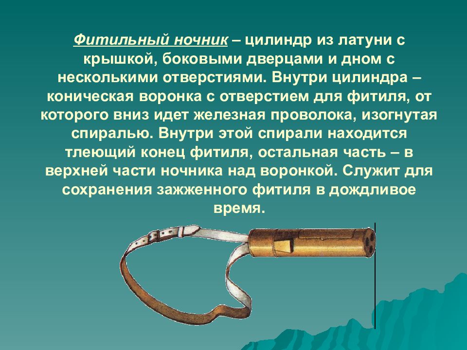 Слайд 16: Фитильный ночник – цилиндр из латуни с крышкой, боковыми дверцами и дном с несколькими отверстиями. Внутри цилиндра – коническая воронка с отверстием для фитиля, от которого вниз идет железная проволока, изогнутая спиралью. Внутри этой спирали находится тлеющий конец фитиля, остальная часть – в верхней части ночника над воронкой. Служит для сохранения зажженного фитиля в дождливое время