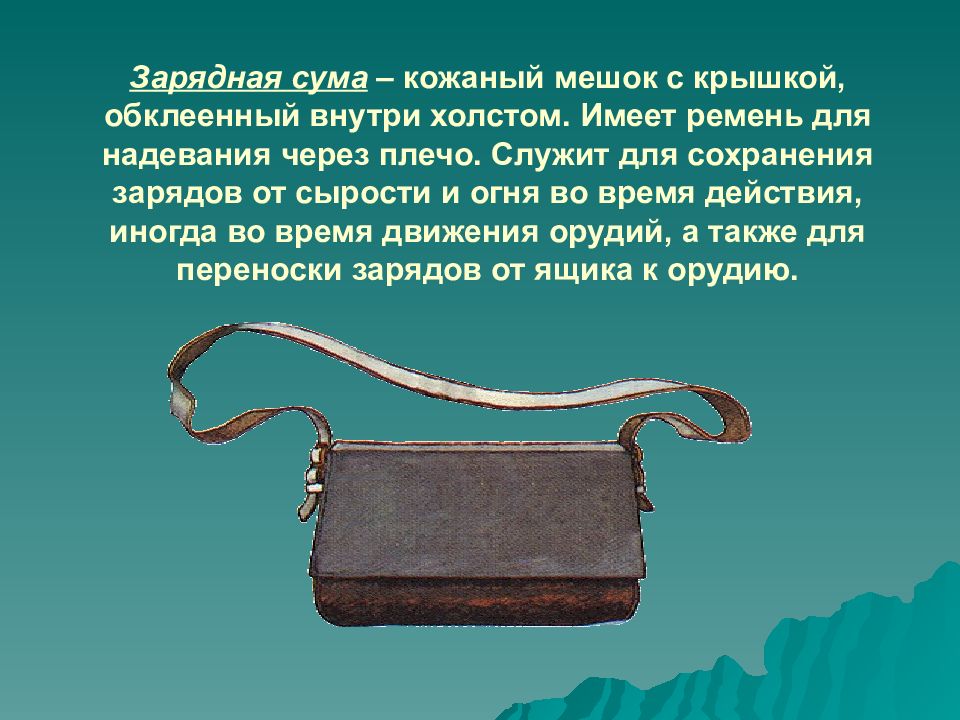 Слайд 17: Зарядная сума – кожаный мешок с крышкой, обклеенный внутри холстом. Имеет ремень для надевания через плечо. Служит для сохранения зарядов от сырости и огня во время действия, иногда во время движения орудий, а также для переноски зарядов от ящика к орудию