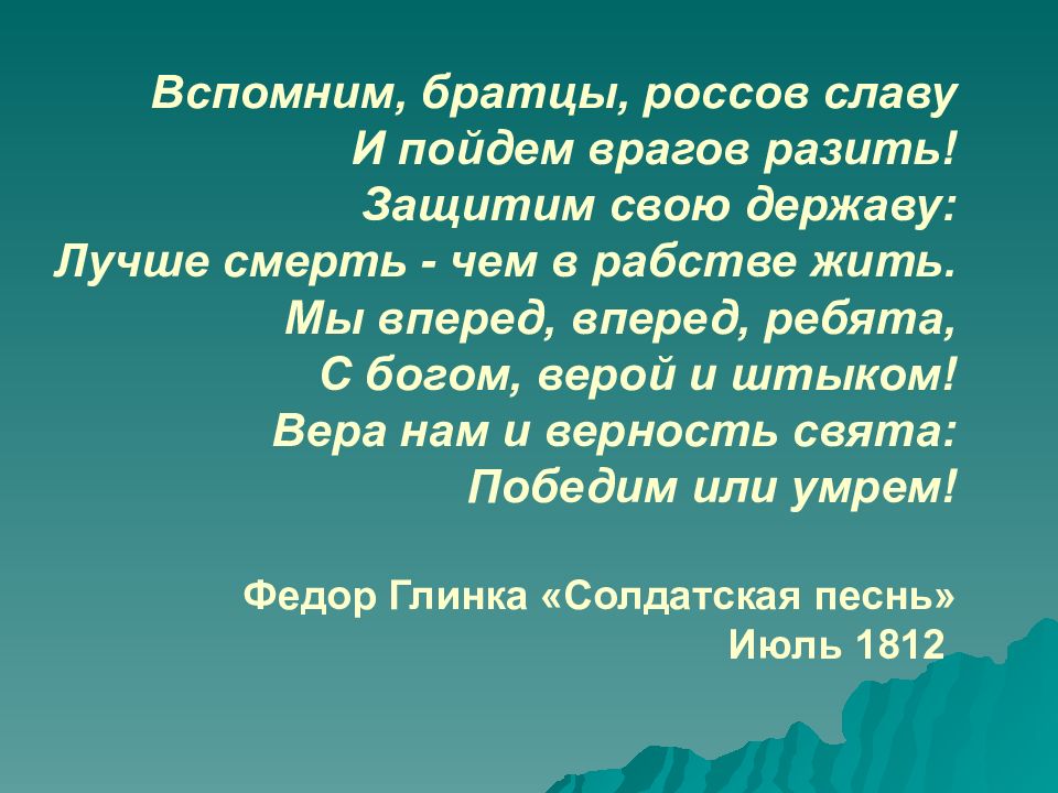 Слайд 2: Вспомним, братцы, россов славу И пойдем врагов разить! Защитим свою державу: Лучше смерть - чем в рабстве жить. Мы вперед, вперед, ребята, С богом, верой и штыком! Вера нам и верность свята: Победим или умрем! Федор Глинка «Солдатская песнь» Июль 1812