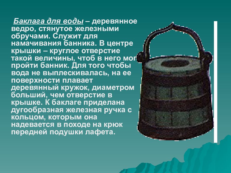 Баклага для воды – деревянное ведро, стянутое железными обручами. Служит для намачивания банника. В центре крышки – круглое отверстие такой величины, чтоб в него мог пройти банник. Для того чтобы вода не выплескивалась, на ее поверхности плавает деревянный кружок, диаметром больший, чем отверстие в крышке. К баклаге приделана дугообразная железная ручка с кольцом, которым она надевается в походе на крюк передней подушки лафета.