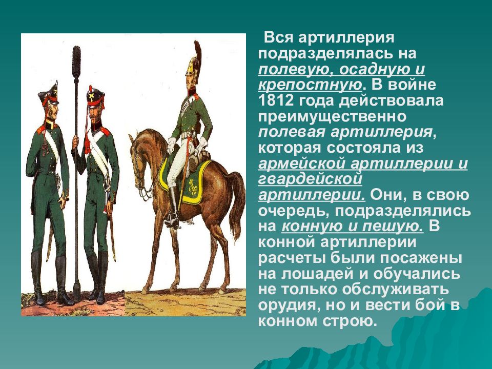 Вся артиллерия подразделялась на полевую, осадную и крепостную. В войне 1812 года действовала преимущественно полевая артиллерия, которая состояла из армейской артиллерии и гвардейской артиллерии. Они, в свою очередь, подразделялись на конную и пешую. В конной артиллерии расчеты были посажены на лошадей и обучались не только обслуживать орудия, но и вести бой в конном строю.